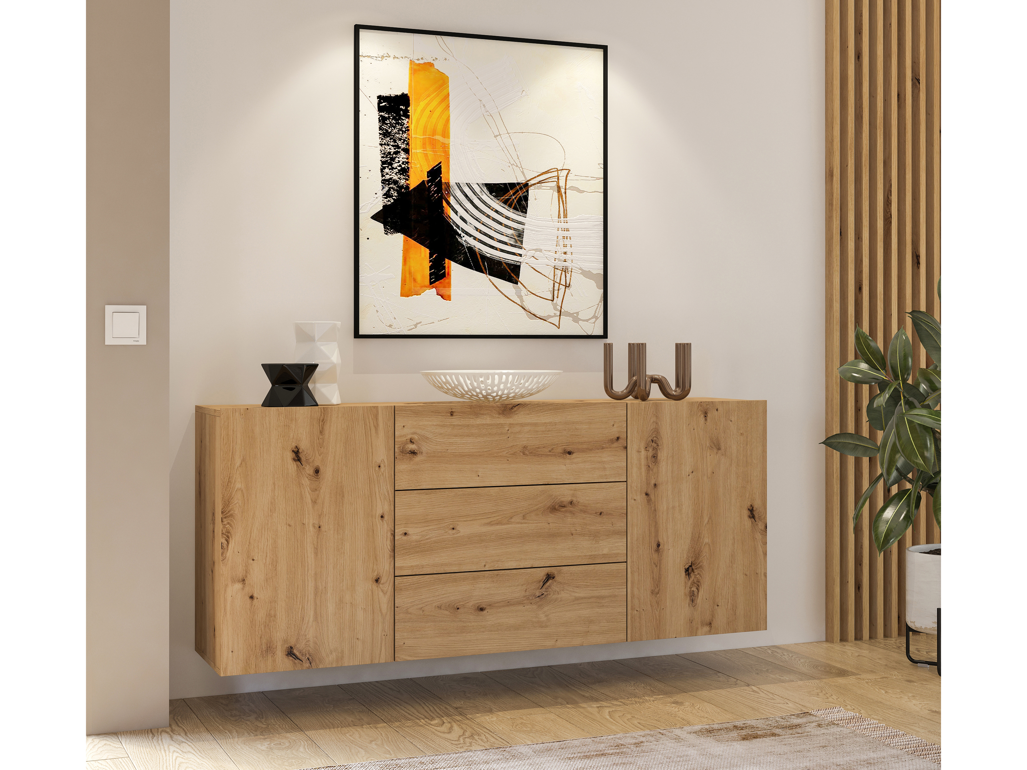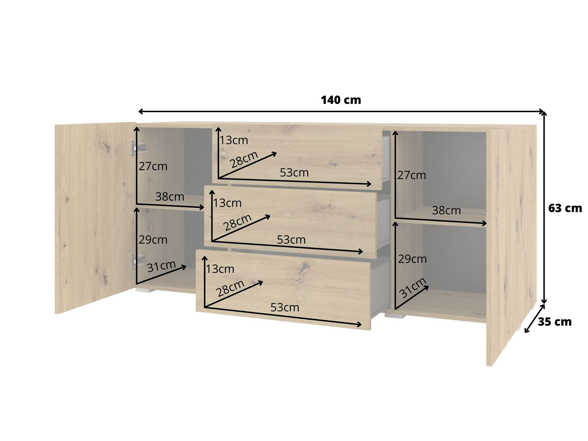 Komoda Avernic Typ 26 (čierna + dub artisan) s výškou 63 cm a hĺbkou 35 cm je moderným nábytkovým kúskom, ktorý by sa mal stať súčasťou každej domácnosti. Táto komoda obsahuje dve poličky skryté za dvierkami a tri šuflíky, ktoré sa otvárajú jednoduchým zatlačením vďaka systému push to open. Je vyrobená z laminovanej dosky a má guľôčkové pojazdy. Komodu je možné šikovne zavesiť na stenu, čo ju robí vhodnou aj do miestností s menej priestoru. Vďaka svojmu dizajnu v čierno-dubovom prevedení s označením Dub Artisan sa stane nenahraditeľným prvkom vášho interiéru.
