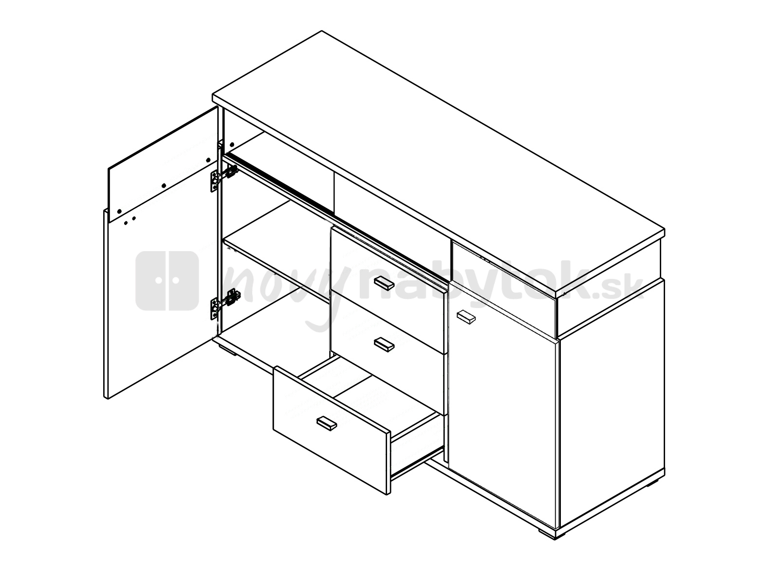 Trojdielna komoda s množstvom úložného priestoru s poličkami, ktorý je uzavretý dvierkami. V strednej časti sú umiestnené tri zásuvky. Horná časť komody je presklená a efektne podsvietená dodávaným LED osvetlením. To nielen zvýrazní predmety umiestnené v nej, ale aj navodí príjemnú atmosféru celého priestoru.