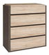 Praktická komoda obsahuje 4 zásuvky, vybavená systémom tichého uzatvárania zásuviek (brzda). Dve možnosti hrany dosky a frontov: šikmý rez hrany: Orech Columbia. Hrany s jemne zaoblenými tvarmi: Dub san remo svetlý.