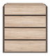 Praktická komoda obsahuje 4 zásuvky, vybavená systémom tichého uzatvárania zásuviek (brzda). Dve možnosti hrany dosky a frontov: šikmý rez hrany: Orech Columbia. Hrany s jemne zaoblenými tvarmi: Dub san remo svetlý.