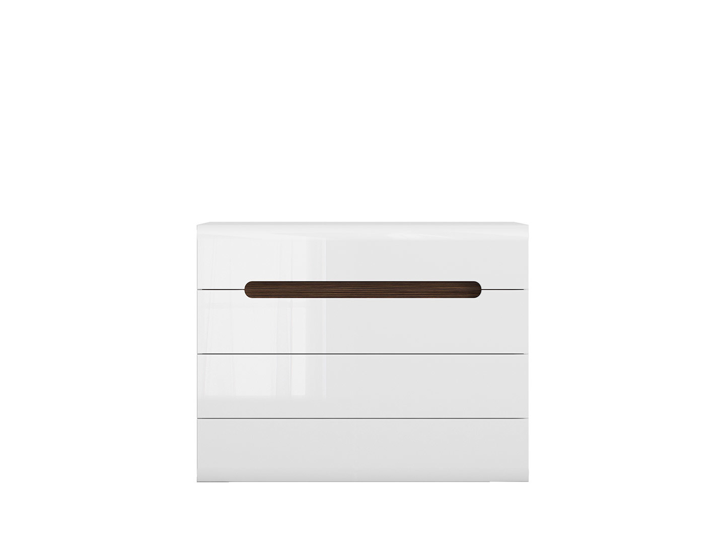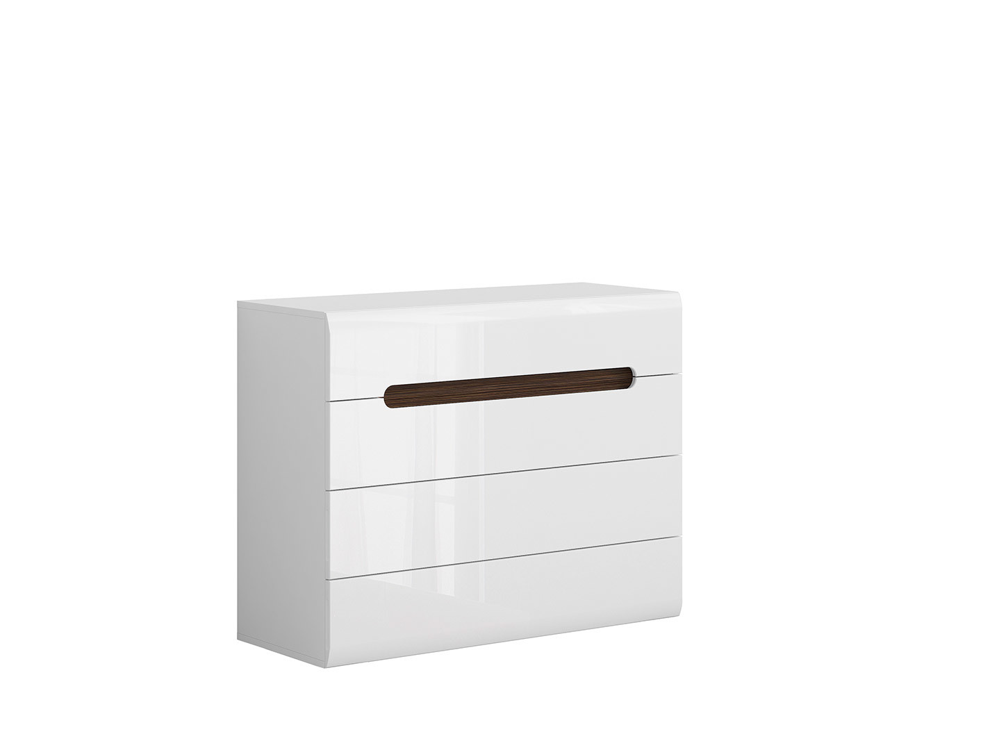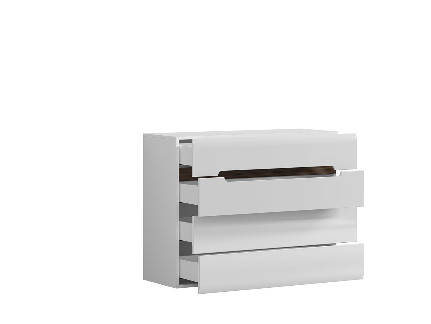Šikovná komoda so štyrmi zásuvkami sa hodí najmä na odloženie oblečenia, či iných doplnkov. Komoda má príjemný moderný dizajn a ozdobnú vložku. Prvé dve zásuvky majú úchyt na prednej strane a dolné dve zásuvky majú nenápadné úchyty po stranách zásuvky. Zásuvky majú tichý dojazd.