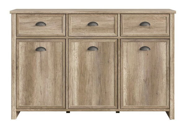 Priestranný príborník v provensálskom štýle so železnými úchytkami. Obsahuje tri zásuvky a tri skrinky. Vo vnútri skriniek je jedna polica. Zásuvky sú na valčekových koľajničkách.