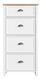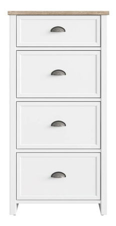 Úzka komoda v provensálskom štýle so železnými úchytkami. Obsahuje štyri zásuvky na valčekových koľajničkách.