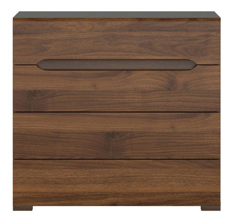 Priestranná komoda obsahuje 4 zásuvky. Prvé dve zásuvky majú úchyt na prednej strane a dolné dve zásuvky máju nenápadné úchyty po stranách čielka zásuvky.