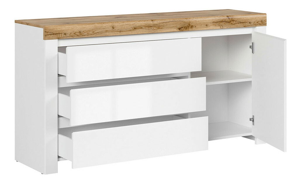 ZobraziťKomfortná komoda Holten vám umožní ukladať a udržiavať poriadok vo vašich veciach. K dispozícii máte 3 praktické zásuvky a priestrannú skrinku, ktorú môžete voľne používať. Skrinka je vybavená pántmi s tichým zatváracím systémom. Hladké výsuvné zásuvky poskytujú značkové vodítka.