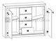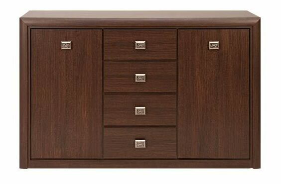 Komoda spájajúca jednoduchý dizajn s elegantnými ozdobnými prvkami. Zútulníte ňou vaše obývacie izby, spálne alebo pracovne. Komoda má dvoje dvierka a uprostred sa nachádzajú štyri zásuvky. Dvierka a zásuvky majú výrazné obdĺžnikové kovové úchyty.
