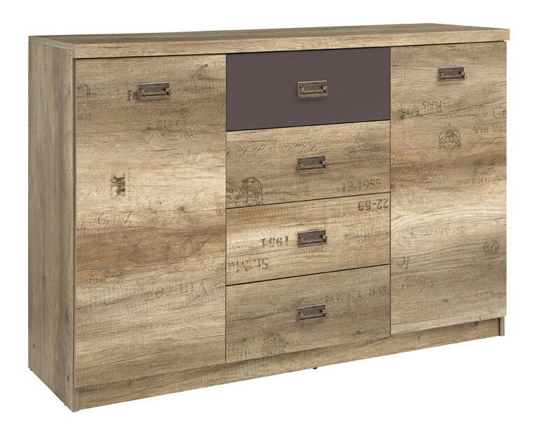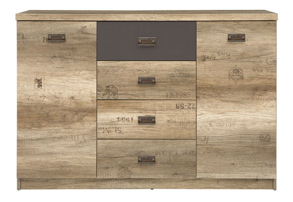 ZobraziťPriestranná komoda KOM2D4S. Komoda obsahuje 4 praktické zásuvky na valčekových koľajničkách a 2 skrinky s policou. Moderná kombinácia farieb korpusu dub canyon monumet + sivý wolfram v spojení s farbami dub canyon monumetn s 3D potlačou + sivý wolfram, na dvierkach skriniek a čelách zásuviek, vytvoria najmodernejšie trendy dnešnej doby.