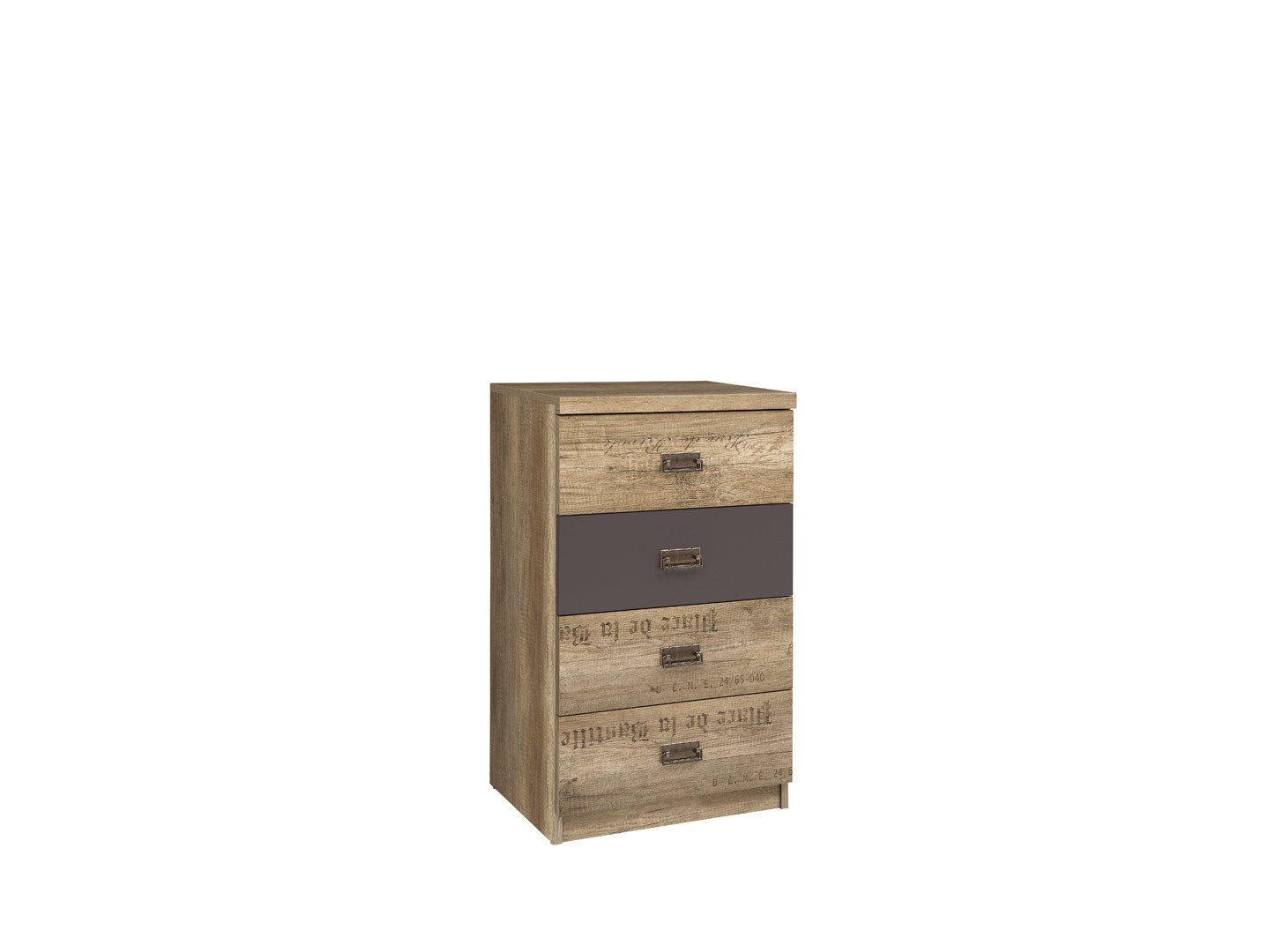 Úzka moderná komoda KOM4S/50. Obsahuje 4 zásuvky na valčekových koľajničkách. Moderná kombinácia farieb korpusu dub canyon monumet + sivý wolfram v spojení s farbami dub canyon monumetn s 3D potlačou + sivý wolfram, na dvierkach skriniek a čelách zásuviek, vytvoria najmodernejšie trendy dnešnej doby.