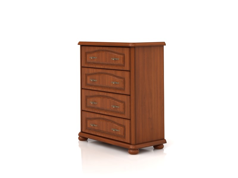 Ozdobne vyrezávaná komoda so štyrmi praktickými zásuvkami. Pekný rustikálny štýl vytvorí vo vašich interiéroch príjemnú atmosféru. Komoda má ozdobné kovové úchyty a široké guľaté nožičky.