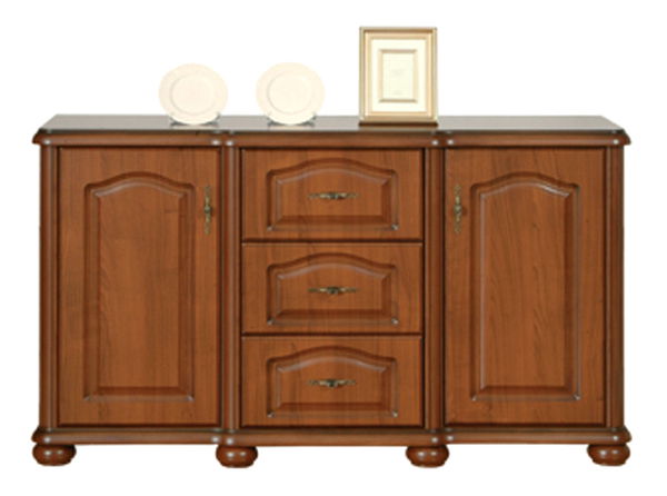 Široká komoda s rustikálnym dizajnom, ktorá má dvoje dvierka a tri zásuvky uprostred. Dvierka a zásuvky sú ozdobne vyrezávané a majú ozdobné kovové úchyty. Dostatok úložného priestoru pre všetky vaše doplnky je zaručená. Komoda je pekným doplnkom obývacích izieb, jedální alebo pracovní.