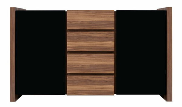 Dvojdverová komoda so štyrmi zásuvkami. Dvierka, lesklé čierne a zásuvky vo farbe orech Merano.