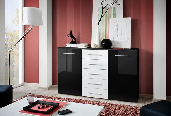 Komoda Fox je vyrobená ako doplnok do obývacích izieb, spální alebo pracovní. Je trojdielna, pričom po stranách je úložný priestor s dvomi policami, ktorý je uzavretý dvierkami. V strede sa nachádza päť zásuviek. Celkový dizajn podtrhujú elegantné podlhovasté uchyty. Vrchná časť komody môže slúžiť ako odkladací priestor na dekoračné predmety. Vďaka množstvu farebných prevedení je ju možné ľahko kombinovať s ostatným nábytkom v miestnosti.