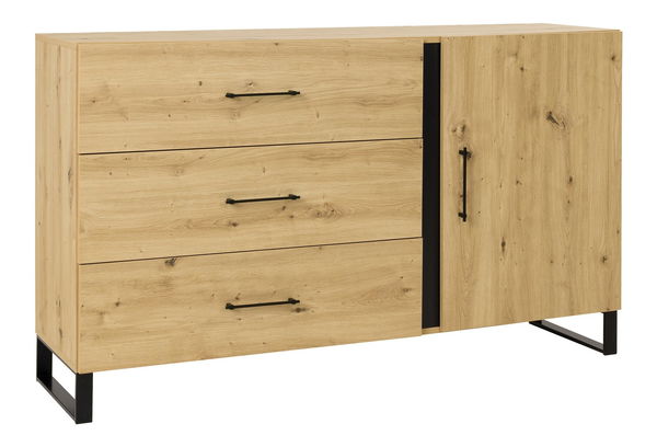 Komoda Filippa F5 (dub artisan + čierna) je uzavretá široká komoda, ktorú môžete umiestniť pod okno alebo k užšej stene, čím sa stane ideálnou voľbou pre kvetináč s kvetmi alebo iné keramické dekorácie. Táto komoda ponúka veľkorysý priestor či už v troch priestranných zásuvkách alebo na poličke za jedným dvierkami. Modelový rad Filippa spojuje moderný a tradičný štýl, ktoré zohľadňujú kovové prvky, ako sú úchytky a nožičky, a drevený dekor s ozdobným pruhom. Skriňa je vyrobená z drevotriesky s ABS hranami a má laminovanú dosku hrúbky 16 mm. Hrany sú pokryté ABS lištou, nožičky sú kovové a majú čiernu farbu, podlhovasté úchytky sú tiež kovové a majú čiernu farbu. Systém otvárania zásuviek je guľôčkový, typ závesu dvierok sú kovové pánty GTV. Prevedenie je matné a komoda má jeden dvierka, tri zásuvky a jednu poličku. Produkt je balený do dvoch balíkov, pričom prvý váži 33,5 kg a jeho rozmery sú 8,6x40,5x155 cm, druhý balík váži 19 kg a má rozmery 9x60,5x79,5 cm.