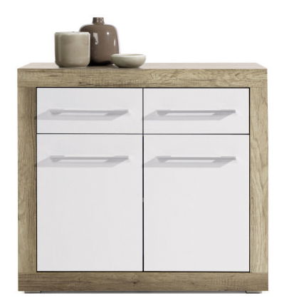 Dvojdielna komoda v exotickom farebnom prevedení dreva country oak v kombinácii s bielym leskom. Obsahuje dve zásuvky a dvoje dvierka s úložným priestorom s poličkou. Komoda sa odporúča kombinovať s predsieňou Inter Fox.