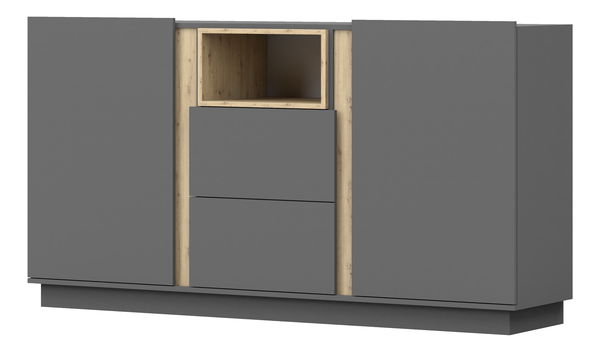 Komoda - Gabrielle 04 (dub artisan + sivá) s výškou 96,6 cm, šírkou 180 cm a hĺbkou 42 cm je moderným nábytkovým kúskom ideálnym pre milovníkov minimalistického a čistého dizajnu. Je vyrobená z kvalitnej laminovanej dosky s hrúbkou 16 mm, čo zaručuje jej odolnosť a pevnosť. Bezúchytkový design pridáva hladký a nepretržitý vzhľad a zjednodušuje jej používanie. Komoda je stabilná a robustná, stojí priamo na podlahe bez nožičiek. Za dvomi dverami sa skrývajú tri poličky, ktoré poskytujú veľký úložný priestor pre rôzne predmety. Dve zásuvky navyše ponúkajú miesto na organizáciu menších osobných vecí. Celkový vzhľad a funkčnosť tejto komody ju robia výnimočnou vo všetkých aspektoch a dokonale sa hodí do každej moderného domácnosti.