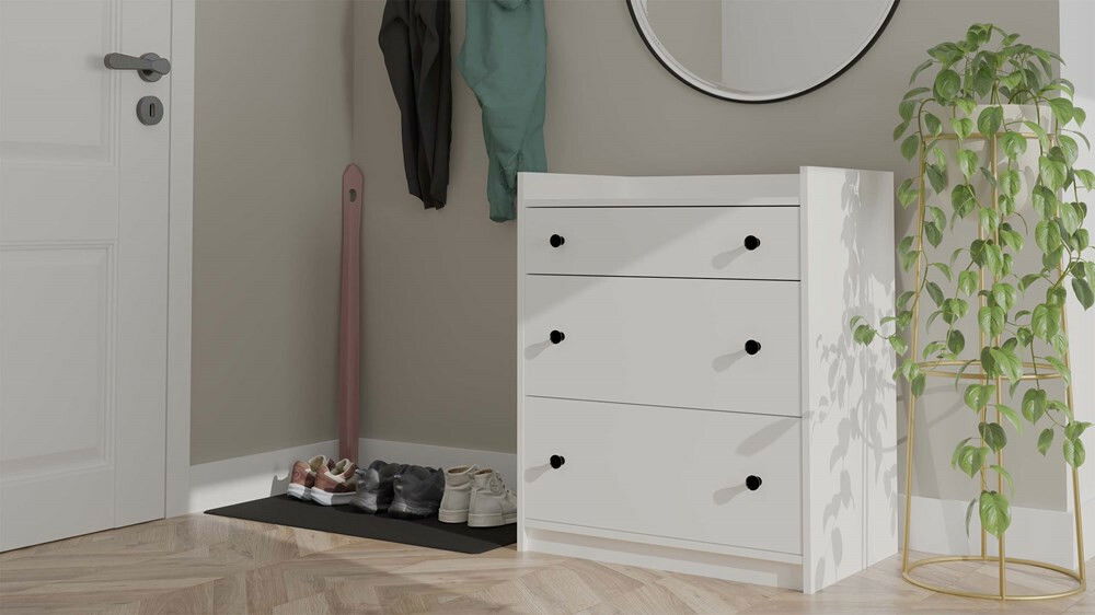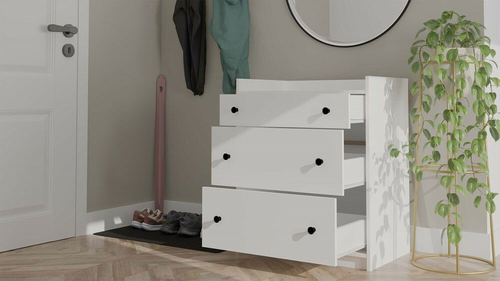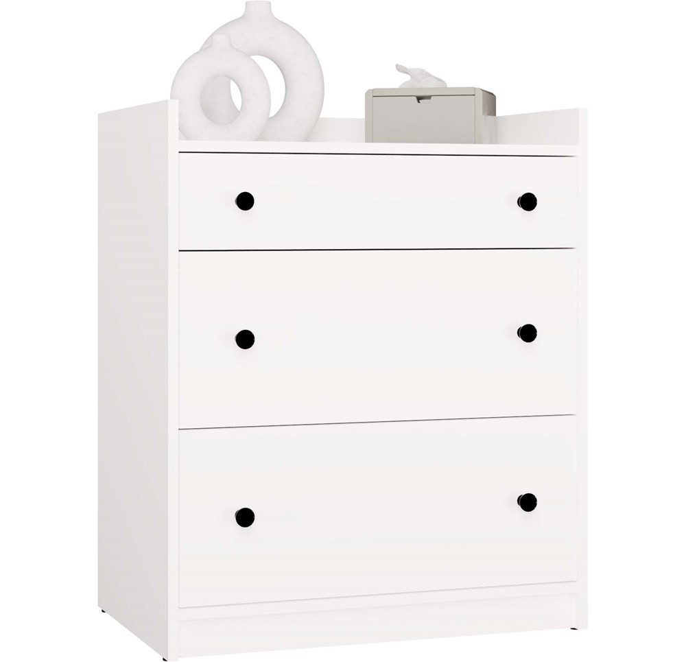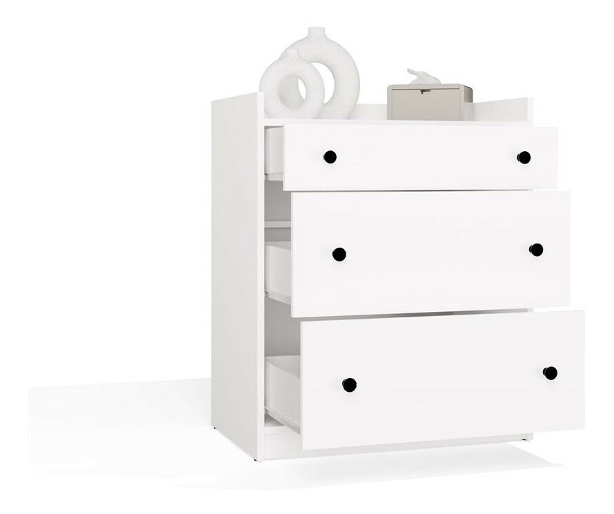 Komoda Houstossa 1 v elegantnej bielej farbe je ideálnym riešením pre každú domácnosť, či už do detskej izby, spálne, obývačky alebo predsiene. Jej minimalistický dizajn a stabilná forma sa skvele hodia do rôznych interiérových štýlov. S tromi priestrannými zásuvkami na valčekových vodidlách ponúka dostatok úložného priestoru na oblečenie, textílie či iné drobnosti. Vyvýšené horné okraje zabraňujú pádu predmetov, čo z nej robí funkčný a bezpečný nábytok. Tento kus nábytku je skvelou voľbou pre tých, ktorí hľadajú kombináciu estetiky a praktickosti.