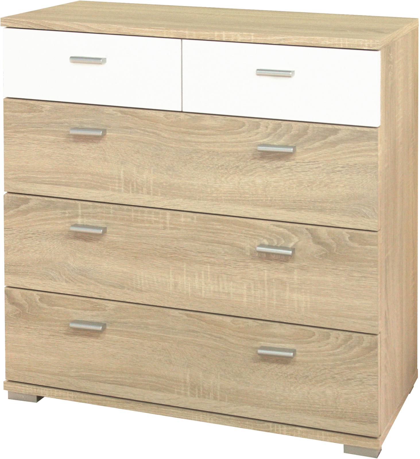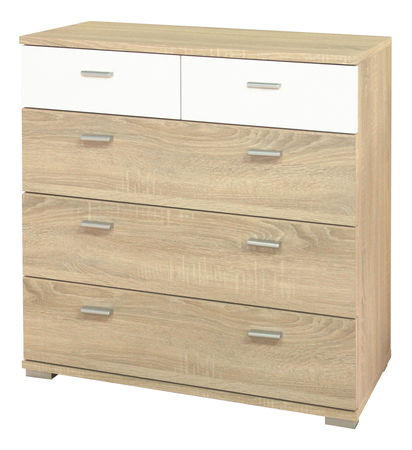 Komoda so štyrmi zásuvkami v dvoch radoch vo farebnom prevedení dub sonoma. Horné dve zásuvky sú v bielej farbe.