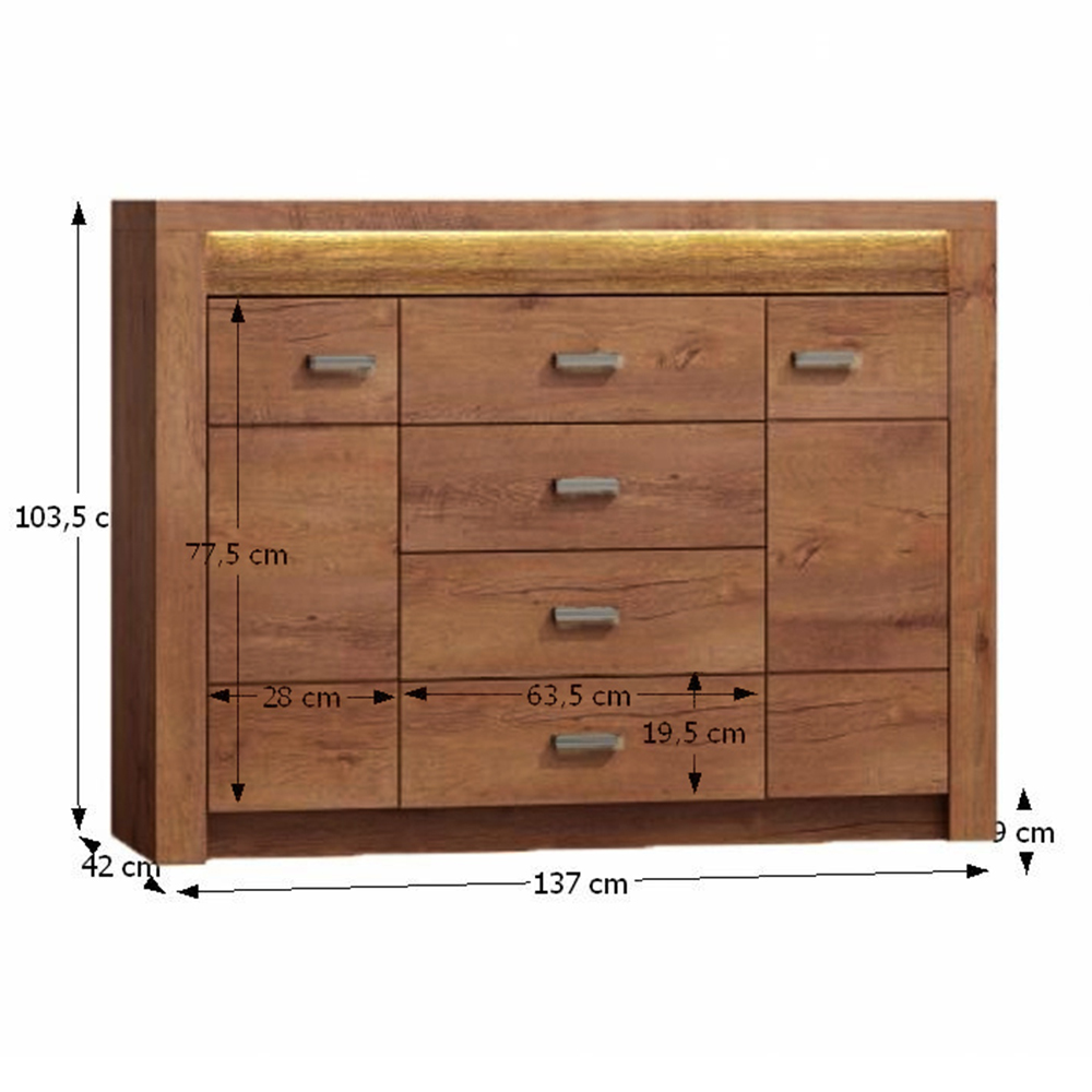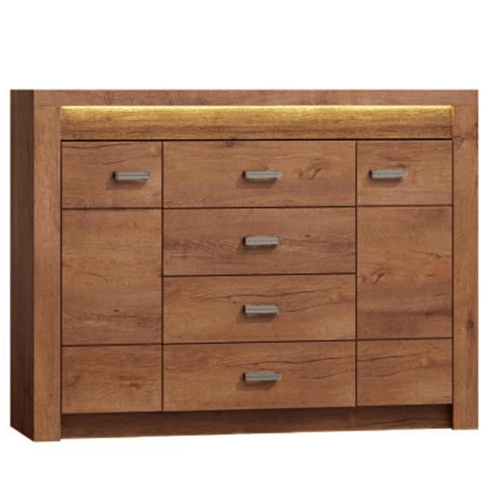 Široká komoda Inneas sa stane skvelou ozdobou vašej obývacej izby. Komoda má po ľavej aj pravej strane dvierka. V strednej časti sa nachádzajú štyri zásuvky. K vitríne je možné doobjednať efektné LED osvetlenie.