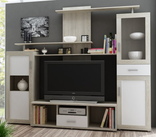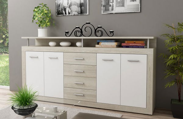 Komoda Jachim - Juno je vyrobená z laminovanej DTD vo farebnej kombinácii dreva dub sonoma s bielou. Úložný priestor je rozdelený na dve skrinky s dvomi dvierkami, štyri zásuvky a vyvýšenú časť pre odkladanie dekoračných predmetov. Dvierka komody sú matné. Odporúča sa kombinovať s obývacou stenou Jachim - Juno.