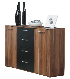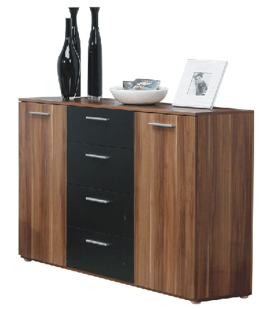 Elegantná komoda Juliet v prevedení orech a čiernej farby s minimalistickými sivými úchytmi. Komoda má po stranách dvierka, za ktorými sa nachádzajú poličky. V strede komody sú umiestnené 4 zásuvky v čiernej farbe.
