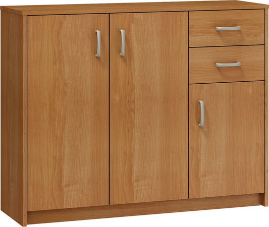 Elegantná trojdielna komoda. Na ľavej strane sa nachádza skrinka s dvomi dvierkami a napravo od nej sa na spodku nachádzajú dvierka skrinky a nad nimi sú umiestnené 2 zásuvky. Dodáva sa vo farebnom prevedení jelša.
