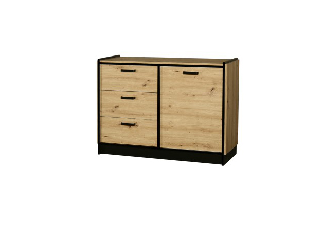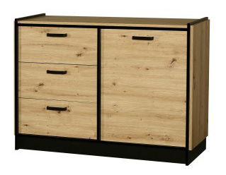 Komoda Kari 830 s výškou 89,8 cm a hĺbkou 43 cm v dubovom a čiernom prevedení je ideálnym nábytkom pre každú domácnosť. Materiál fronty predstavuje laminovaná doska s hrúbkou 16 mm, zatiaľ čo korpus je vyrobený z rovnakého materiálu. Produkty s ABS hranami zvyčajne vykazujú vysokú odolnosť voči poškriabaniu a praskaniu, a tak je aj táto komoda. Vďaka svojmu dizajnu a funkčnosti môže byť ideálnym doplnkom vašej obývačky alebo spálne. Táto komoda disponuje dostatočným úložným priestorom pre vaše veci a pomôže vám udržať vašu miestnosť čistou a prehľadnou. Investujte do tejto kvalitnej komody a získajte praktický a elegantný kúsok nábytku, ktorý bude slúžiť vášmu domovu mnoho rokov.