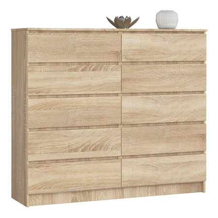 Je vyrobený z kvalitného materiálu, ktorý zabezpečuje dlhú životnosť a odolnosť proti bežnému opotrebovaniu. Komoda ladí s ostatným nábytkom ako sú minimalistické šatníkové skrine, jedálenské súpravy alebo posteľné rámy, a vďaka neutrálnej farbe dub sonoma prinesie do spálne, obývačky či predsiene príjemnú atmosféru a svetlosť priestoru.