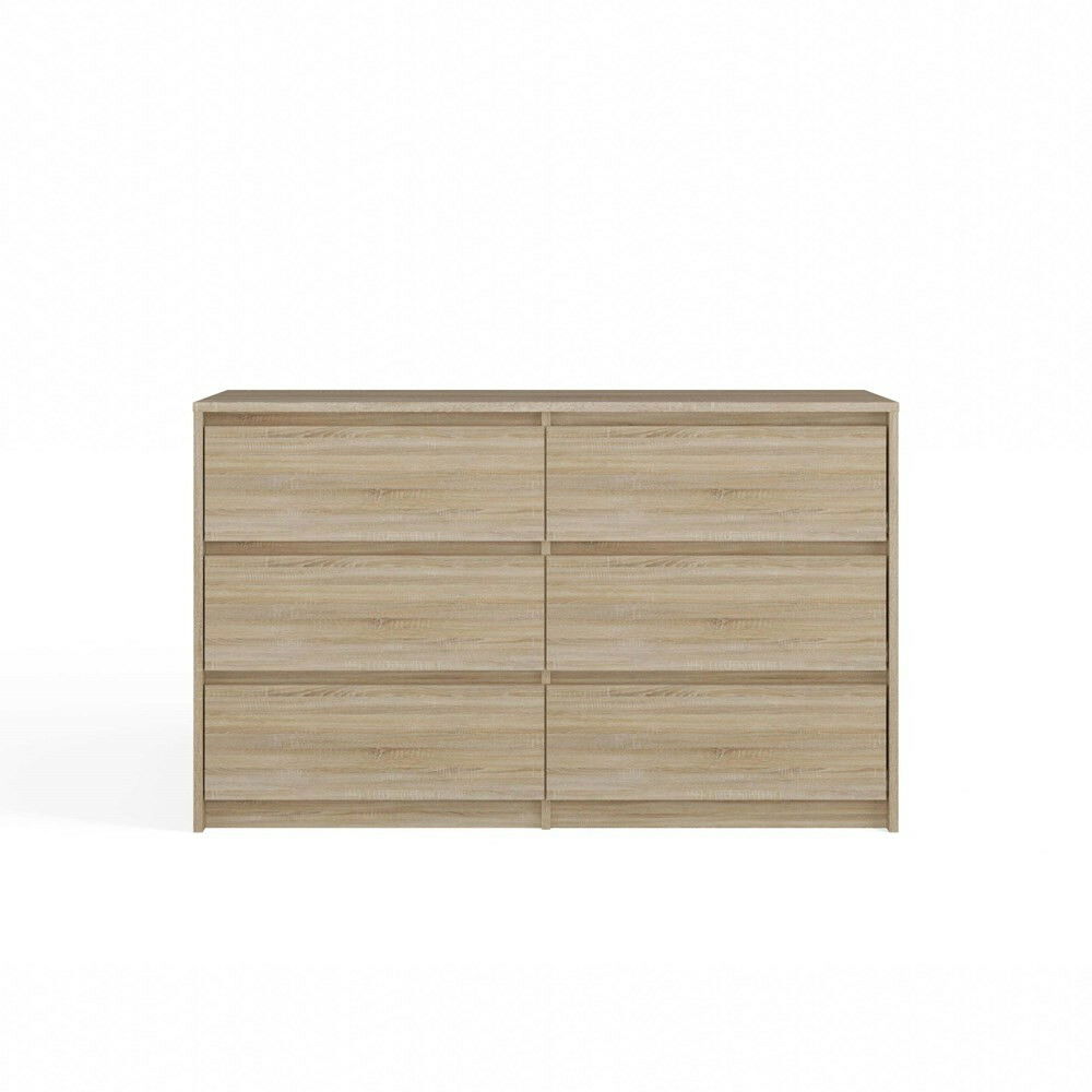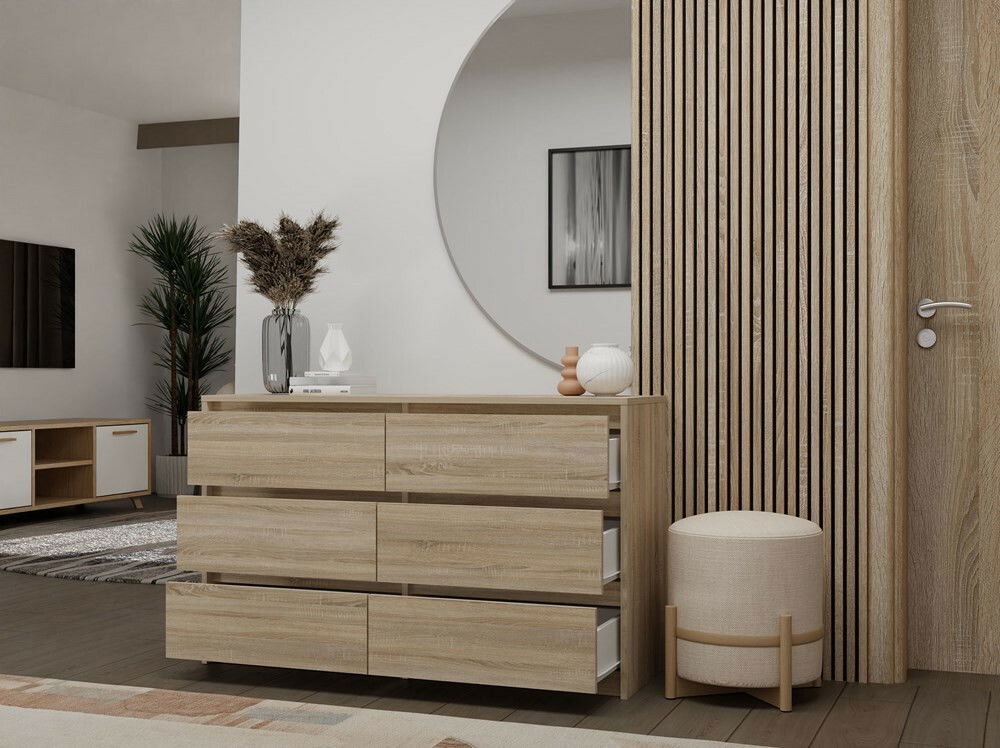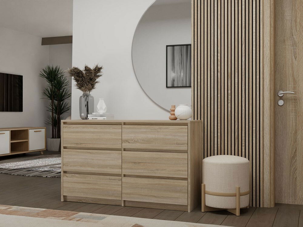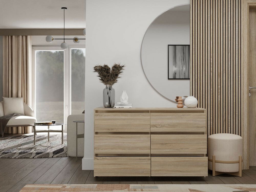 ZobraziťKomoda Kentero 3 v elegantnej farbe dub sonoma je ideálnym riešením pre každú modernú domácnosť. S jej minimalistickým dizajnom a bezúchytkovými frontami sa stane skvostom vo vašej spálni, obývačke alebo detskej izbe. Tento funkčný nábytok ponúka šesť priestranných zásuviek, ktoré zabezpečia dostatok úložného priestoru a pohodlné používanie. Korpus a fronty sú vyrobené z kvalitnej laminovanej drevotriesky, čo zaručuje dlhú životnosť a jednoduchú údržbu. Komoda Kentero 3 je skvelou voľbou pre tých, ktorí hľadajú spojenie štýlu a praktickosti.
