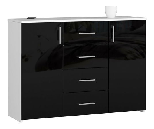 Komoda Kiran (čierny lesk) je moderný a elegantný kus nábytku, ktorý sa skvele hodí do každého interiéru. S výškou 80 cm, šírkou 110 cm a hĺbkou 35 cm poskytuje dostatok úložného priestoru pre váš domáci tovar. Vďaka svojmu čiernemu lesku vytvára táto komoda štýlový a sofistikovaný dojem. Je vyrobená z kvalitných materiálov, čo zaručuje jej odolnosť a dlhú životnosť. Komoda Kiran je praktická a funkčná vo svojom dizajne a poskytuje vám možnosť udržať vaše veci v poriadku a organizované. S touto komodou získate nielen praktický a efektívny kus nábytku, ale aj moderný a štýlový doplnok do vášho domova.