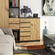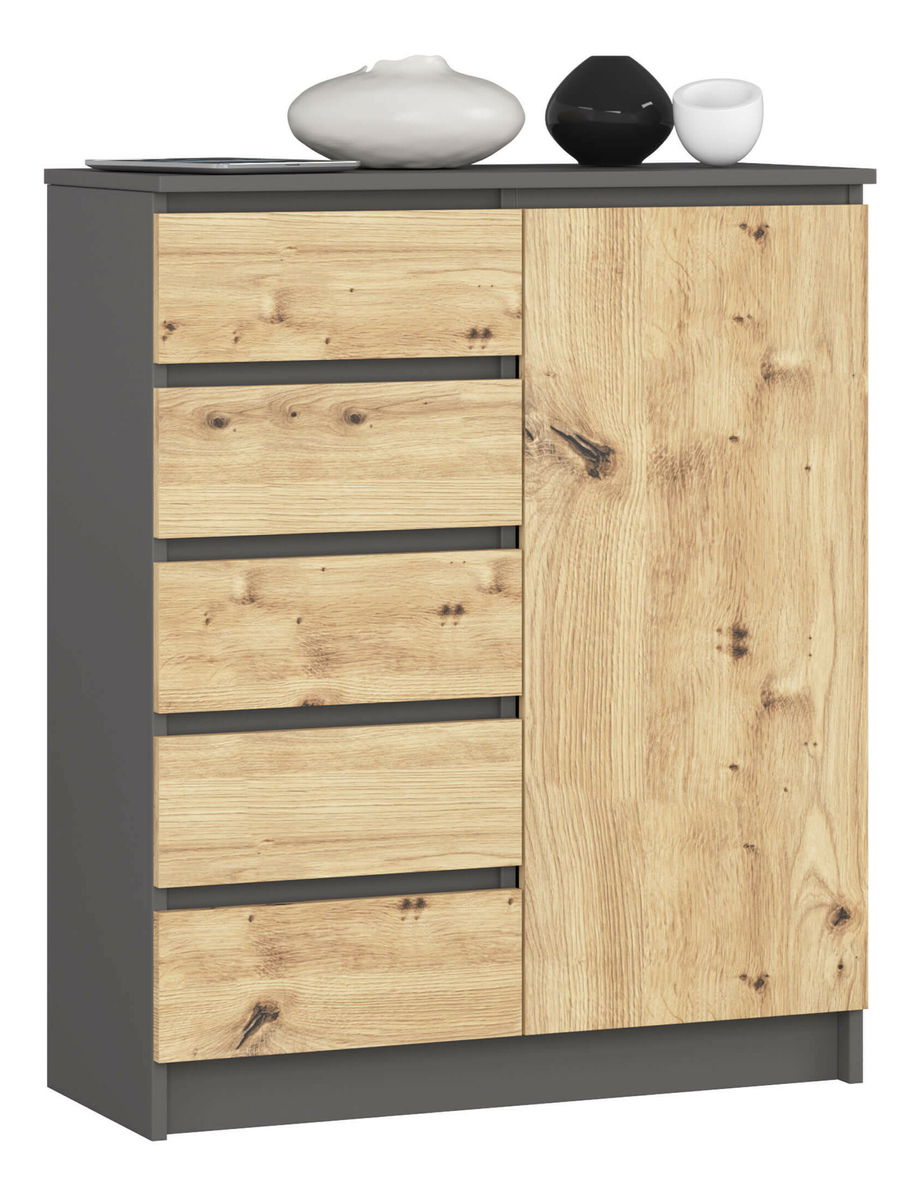 Kombinácia tmavého grafitového korpusu a prírodného dreveného dekoru dvierok a zásuviek vytvára harmonický kontrast, ktorý skvelo doplní obývačky, jedálne aj spálne zariadené v škandinávskom či industriálnom štýle.
