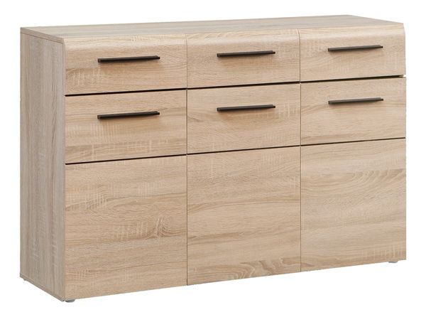 Trojdielna komoda so zásuvkami a úložným priestorom s poličkou.
