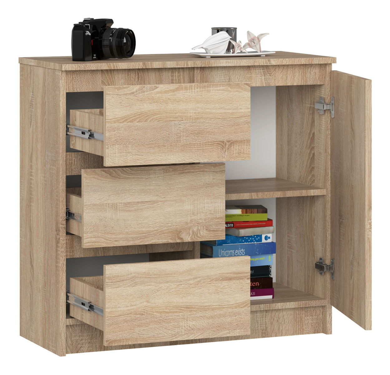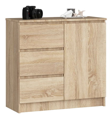 Komoda Komeito v prevedení dub sonoma predstavuje funkčný a štýlový doplnok do vášho interiéru. Jej praktické rozdelenie na tri zásuvky a skrinku ponúka dostatok úložného priestoru na usporiadanie drobností v obývačke, spálni či chodbe.