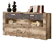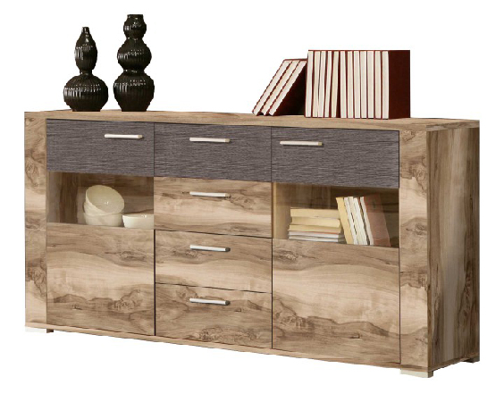 Štýlová trojdielna komoda Koror, ktorá je predurčená k obývacej stene Koror. V strede sú 4 zásuvky a horná zásuvka je v odtieni dub denver. Po stranách sa nachádzajú dvierka čiastočne v odtieni dub denver, potom orech satinový a sklo.