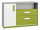 Komoda je rozdelená na dve časti. Ľavá strana je uzavretá a má dve police. Pravá strana má vrchnú časť otvorenú, kde sa nachádza jedna polica a pod ňou dve zásuvky.
