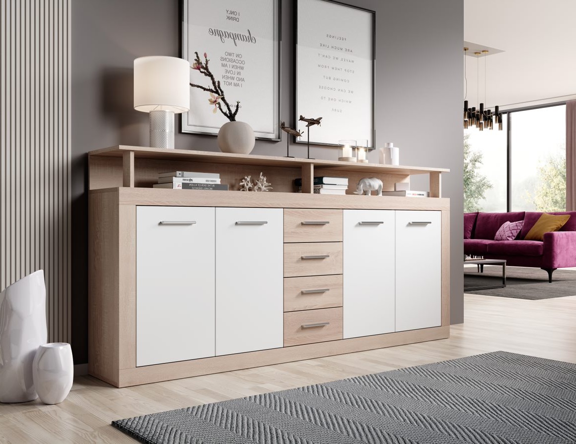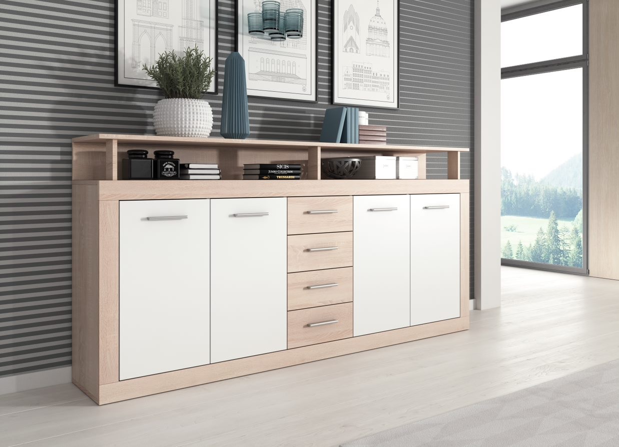 Komoda Lenita XXL (Dub sonoma + Biela) s výškou 95 cm a hĺbkou 32 cm je ideálnym doplnkom pre Váš interiér, či už sa rozhodnete pre svetlé alebo tmavé farby. Táto komoda ponúka veľký úložný priestor až na 4 dverách a 4 zásuvkách s plne výsuvnými guľôčkovými koľajnicami. Má tiež dve police a otvorenú priehradku s rozmormi 190x28,4x16 cm. Nožičky sú vyrobené z plastu v čiernej farbe a majú výšku 1,5 cm. Rukoväť je tiež z plastu v striebornej farbe a rozmery sú 12x2,4x1,2 cm. Komoda je vyrobená z drevotriesky, laminátu, ABS hrán a HDF zadnej strany s hrúbkou materiálu 16 mm a hrúbkou ABS 0,5 mm. Zadná strana je z HDF a laminátu s hrúbkou 2,5 mm. Nechajte si túto kvalitnú a praktickú komodu doplniť Váš interiér.