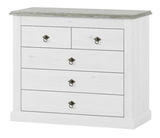 Komoda s troma širokými zásuvkami a 2 úzkymi umiestnenými vedľa seba pod hornou doskou.