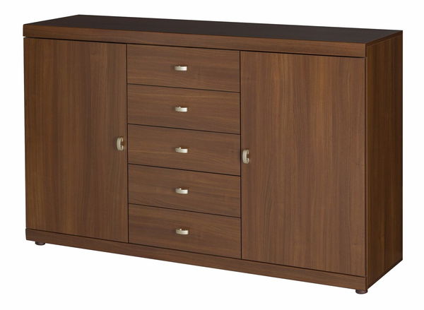 Trojdielna komoda s dvomi dvierkami a piatimi zásuvkami v strede.