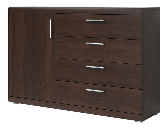 Potrebujete úložný priestor so zásuvkami aj skrinkou? Komoda Merope so 4 zásuvkami a skrinkou je výbornou alternatívou. Skrinka je vo vnútri rozdelená poličkou. Komoda z kvalitných materiálov a odolného lamina v odtieni tmavý dub sonama vá bude slúžiť dlho a spoľahlivo bez ohľadu na to, či bude v šatníku, spálni alebo obývačke.