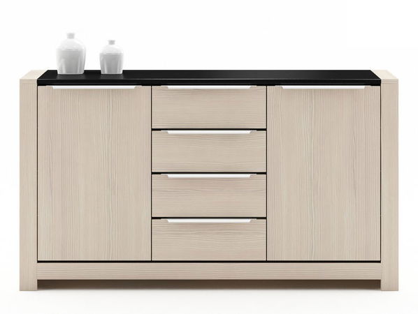 Široká komoda so 4 zásuvkami umiestnenými nad sebou v strede a dvierkami po oboch stranách. Horná doska je v odtieni grafit.