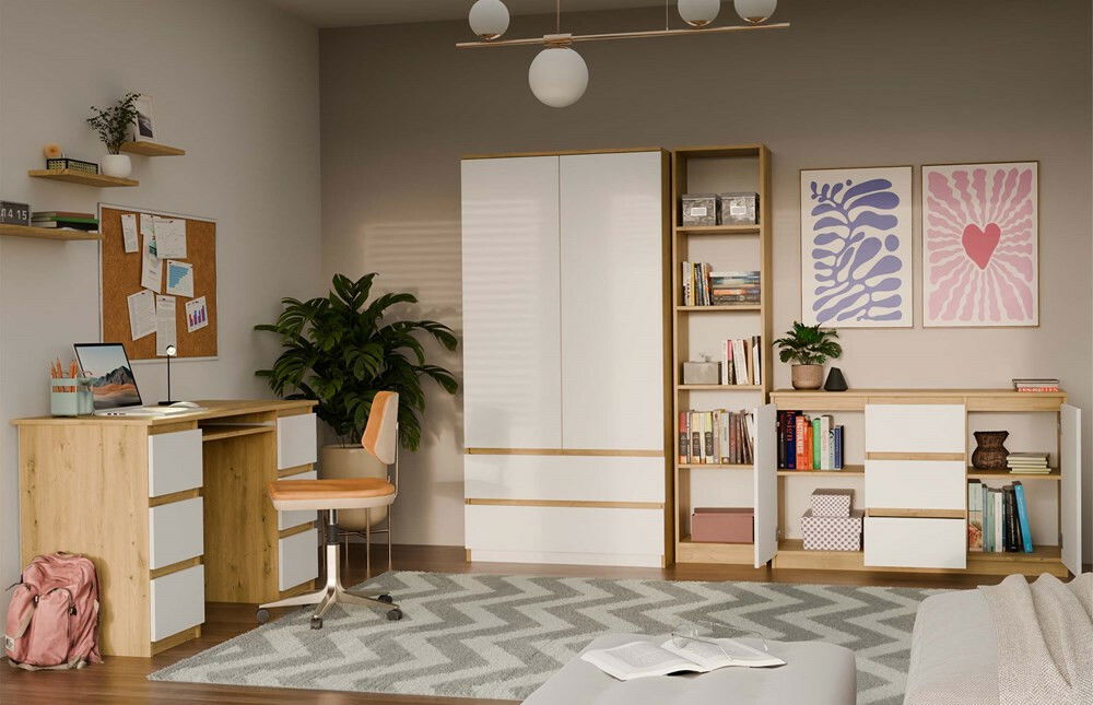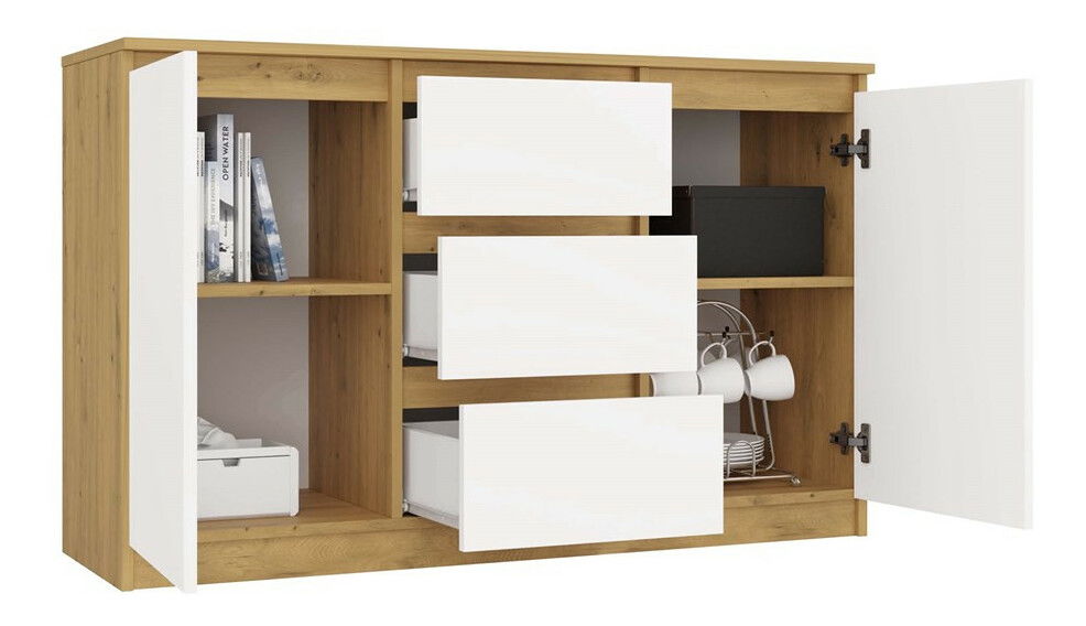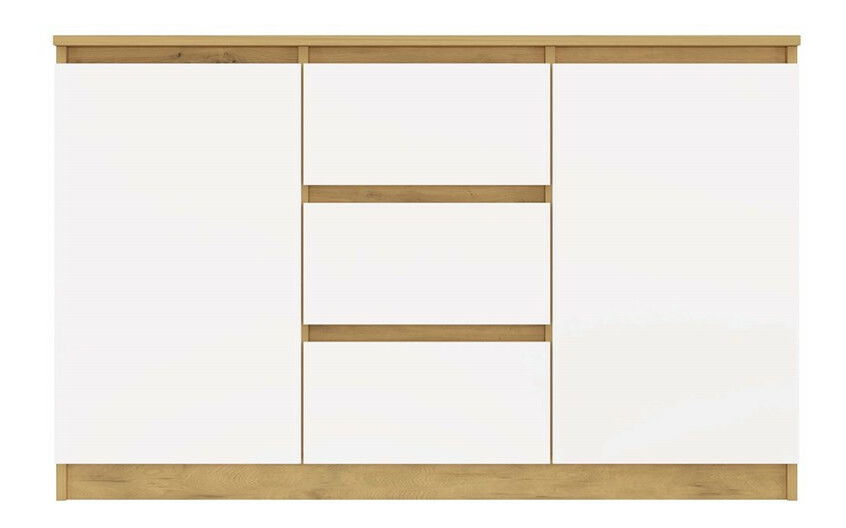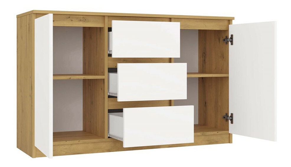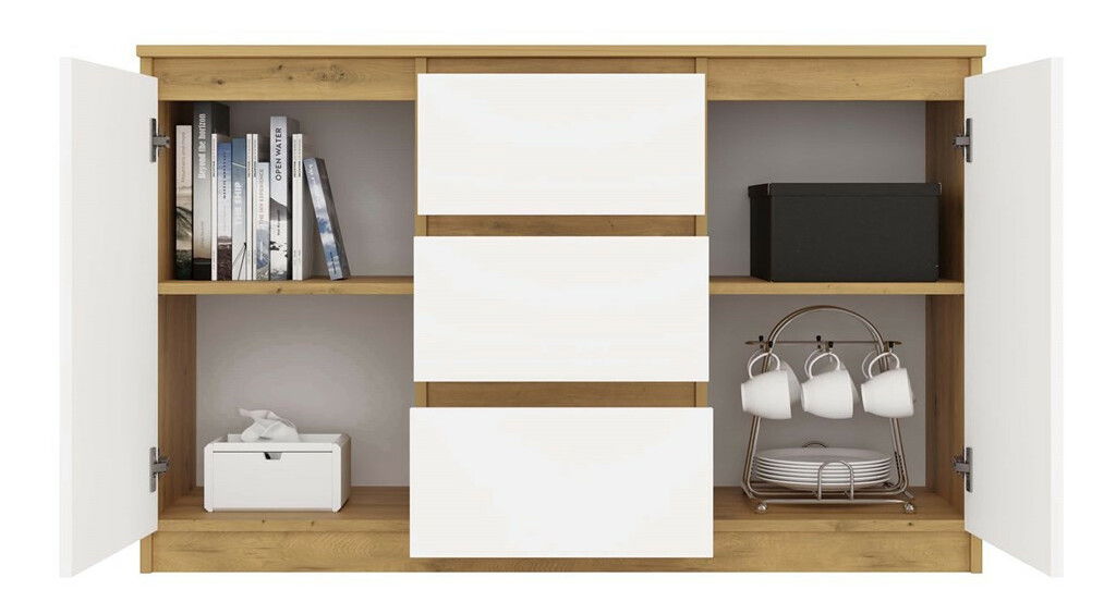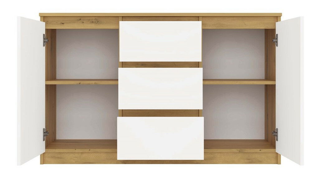 Komoda Musecalo 11 je moderný a funkčný kus nábytku, ktorý dokonale spája elegantný dizajn s praktickosťou. Jej korpus v teplom odtieni dubu Artisan a biele fronty vytvárajú harmonický kontrast, ktorý obohacuje každý interiérové usporiadanie. S dvoma pármi dverí a tromi priestrannými zásuvkami ponúka dostatok úložného priestoru na organizáciu rôznych predmetov. Bezúchytové fronty zabezpečujú pohodlné používanie, zatiaľ čo kvalitné materiály garantujú dlhú životnosť. Komoda Musecalo 11 je ideálnym riešením pre moderné aj tradičné domácnosti.