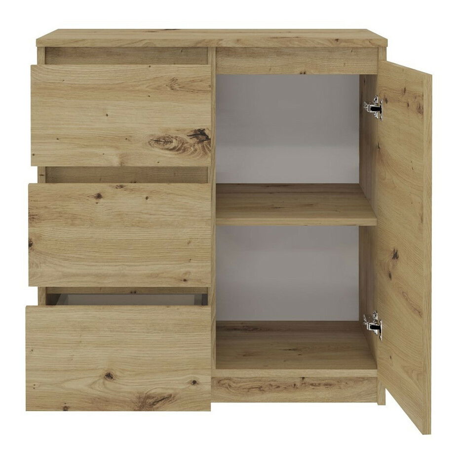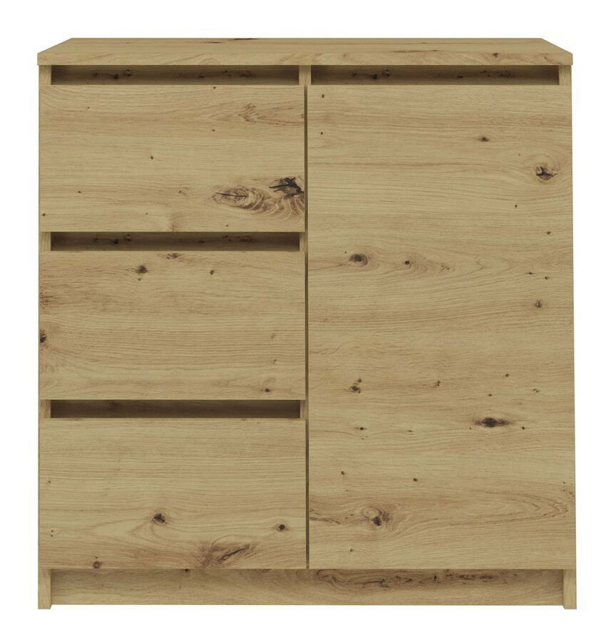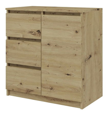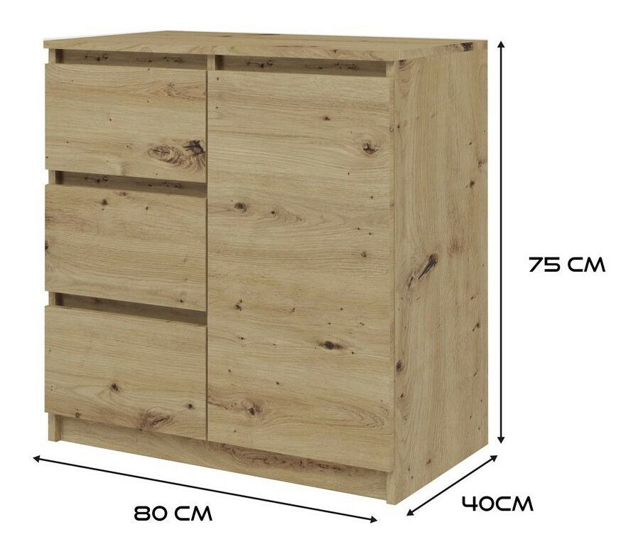 Komoda Musecalo 12 v elegantnej farbe dub artisan je ideálnym riešením pre každú modernú domácnosť. S minimalistickým dizajnom a bezúchytkovými frontami ponúka nielen štýlový vzhľad, ale aj praktické využitie. Je vybavená jednými dverami a tromi zásuvkami, ktoré poskytujú dostatok úložného priestoru pre vaše veci, čím uľahčuje organizáciu a hľadanie potrebných predmetov. Korpus z laminovanej drevotriesky zabezpečuje vysokú kvalitu a odolnosť, čo z nej robí skvelý doplnok do spálne, obývačky alebo detskej izby.