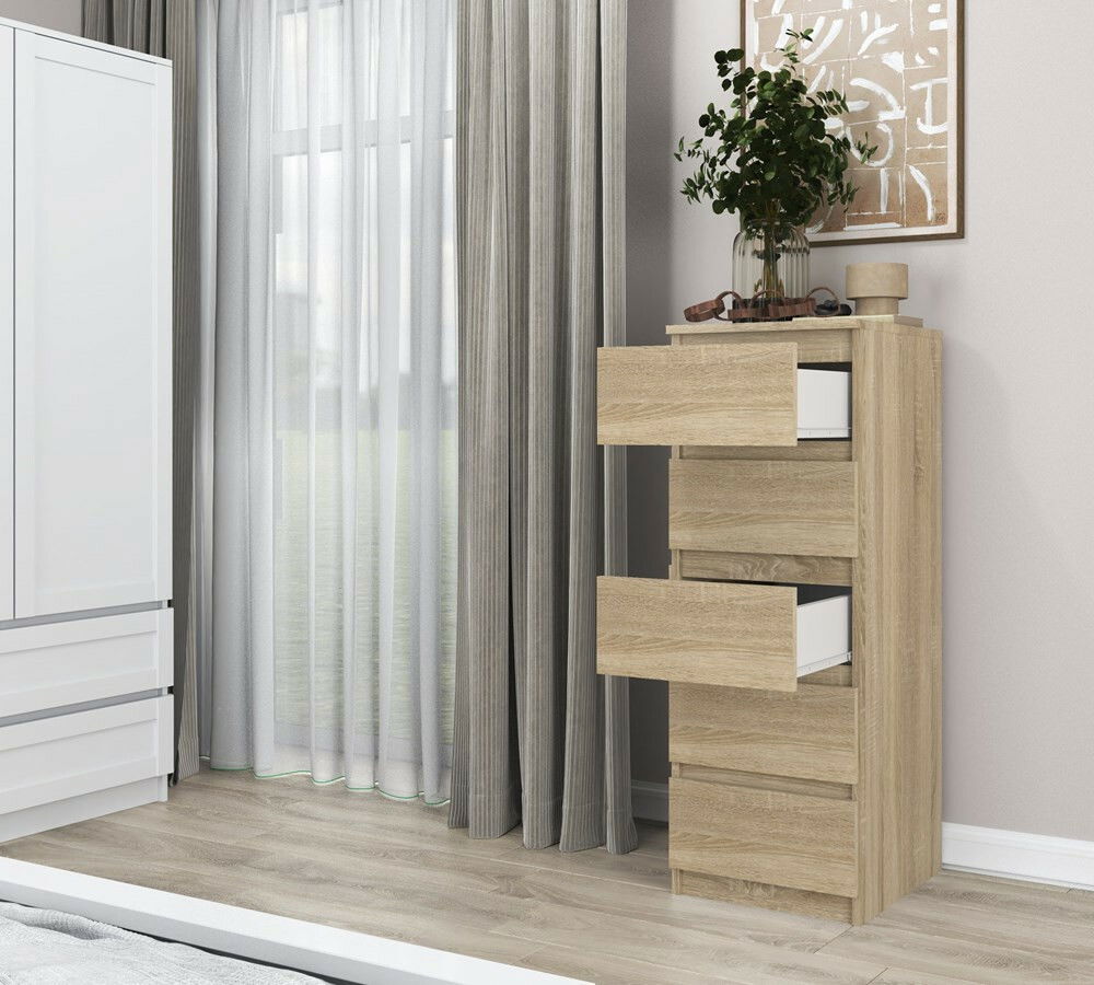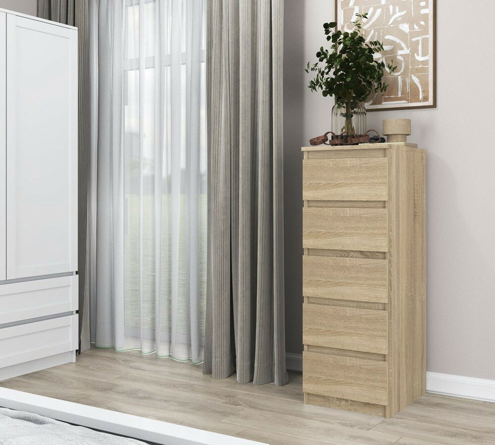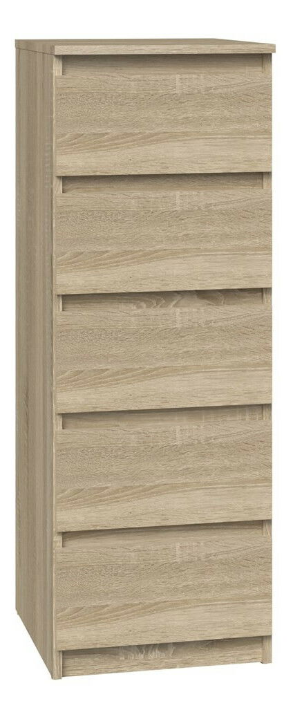 Komoda Musecalo 5 v elegantnej farbe dub sonoma je ideálnym riešením pre moderné interiéry, kde sa kladie dôraz na funkčnosť a štýlový dizajn. S minimalistickou konštrukciou a rozmermi 40 cm na šírku, 45 cm na hĺbku a 111 cm na výšku ponúka dostatok úložného priestoru bez zbytočného zaberania miesta. Plynule vysúvateľné zásuvky so zámkom proti vysunutiu zabezpečujú pohodlné a bezpečné používanie, zatiaľ čo bezúchytové fronty dodávajú nábytku moderný vzhľad. Kvalitné spracovanie a odolné materiály zaručujú dlhú životnosť.
