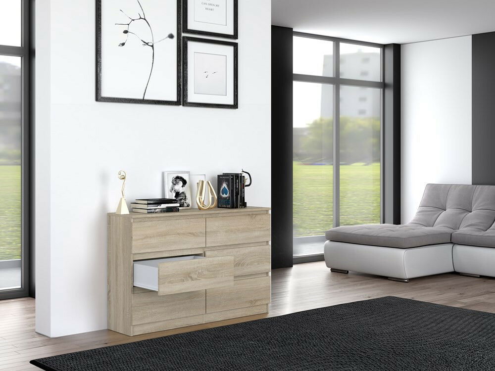 Komoda Musecalo 6 120 v elegantnej farbe dub sonoma je ideálnym riešením pre moderné interiéry. S minimalistickou konštrukciou a šiestimi priestrannými zásuvkami ponúka dostatok úložného priestoru, pričom bezúchytové fronty zabezpečujú pohodlné používanie a podčiarkujú jej súčasný dizajn. Vyrobená z kvalitnej laminovanej drevotriesky s hrúbkou 16 mm, táto komoda je nielen estetická, ale aj funkčná. Tento kus nábytku skvele doplní vašu spálňu, obývačku alebo detskú izbu.