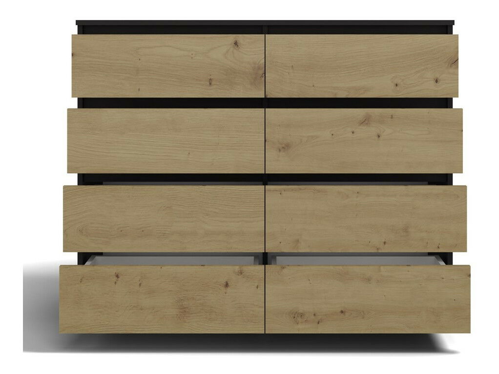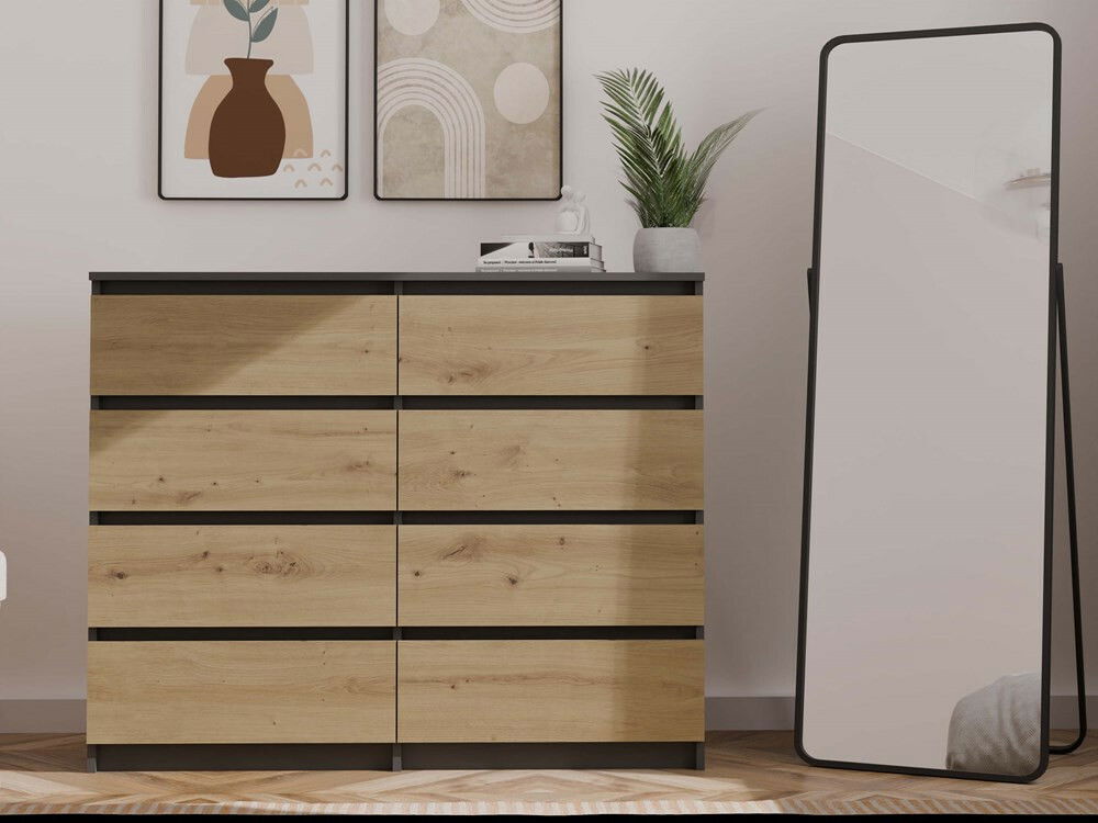 Komoda Musecalo 7 120 je moderný a praktický nábytok, ktorý sa skvele hodí do spálne, obývačky alebo detskej izby. S ôsmimi priestrannými zásuvkami a minimalistickým dizajnom v kombinácii antracitovej farby a dubu artisan ponúka nielen dostatok úložného priestoru, ale aj elegantný vzhľad, ktorý osloví každého, kto ocení spojenie jednoduchosti a štýlu. Bezúchytové fronty zásuviek zabezpečujú pohodlné používanie a podčiarkujú moderný charakter interiéru. Táto komoda je ideálnym riešením pre tých, ktorí hľadajú kvalitu a funkčnosť v jednom.