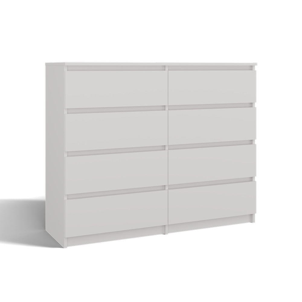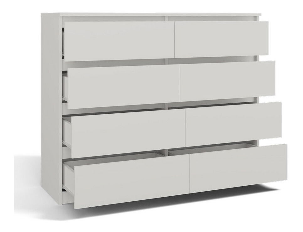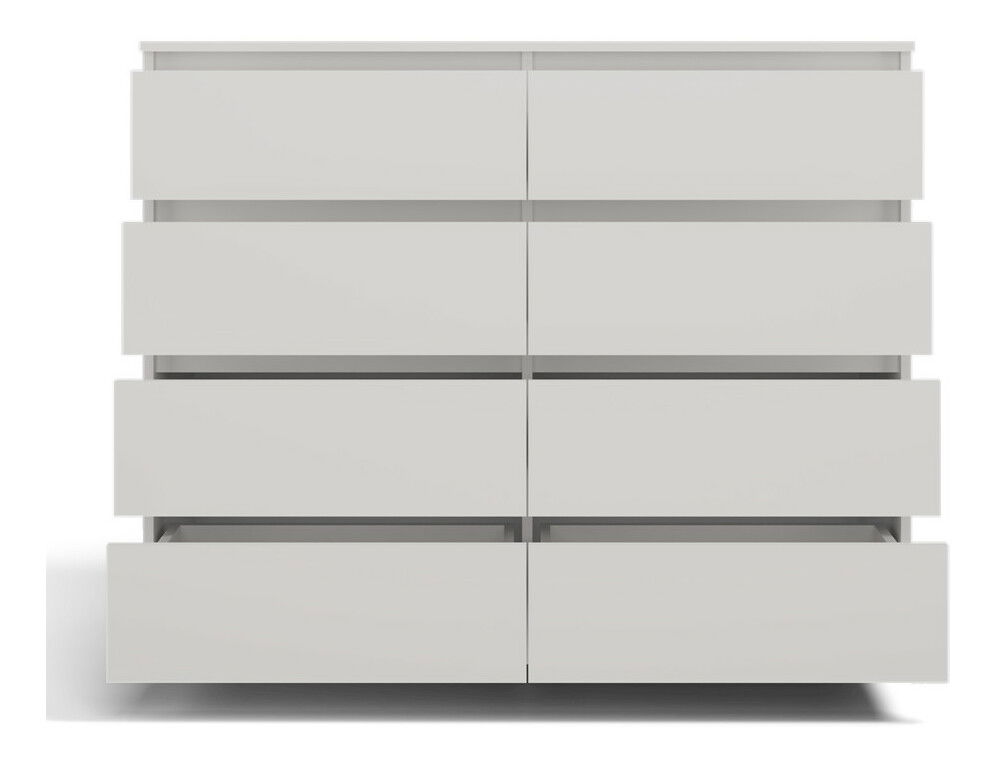 Komoda Musecalo 7 120 v elegantnej bielej farbe je ideálnym riešením pre moderné interiéry, kde sa stretáva funkčnosť s estetikou. S minimalistickou konštrukciou a bezúchytkovými frontami ponúka osem priestranných zásuviek, ktoré zabezpečujú pohodlné a bezpečné uskladnenie vašich vecí. Vyrobená z kvalitnej laminovanej drevotriesky, táto komoda je nielen praktická, ale aj odolná voči každodennému používaniu. Jej nadčasový dizajn a kvalitné spracovanie z nej robia skvelý doplnok do spálne, obývačky či detskej izby.