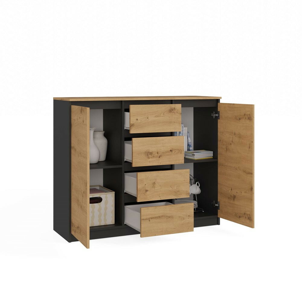 ZobraziťKomoda Musecalo 8 je moderný a praktický nábytok, ktorý skvele zapadne do každej spálne, obývačky alebo detskej izby. S jej elegantným dizajnom v kombinácii antracitovej a bielej farby ponúka nielen štýlový vzhľad, ale aj dostatok úložného priestoru. Vnútorné usporiadanie zahŕňa dve dvere a štyri zásuvky, ktoré zabezpečujú prehľadnosť a jednoduchý prístup k veciam. Minimalistická konštrukcia bezúchytkových frontov podčiarkuje moderný charakter nábytku, pričom kvalitné materiály zaručujú dlhú životnosť. Tento kus nábytku je ideálnym riešením pre tých, ktorí hľadajú kombináciu funkčnosti a estet