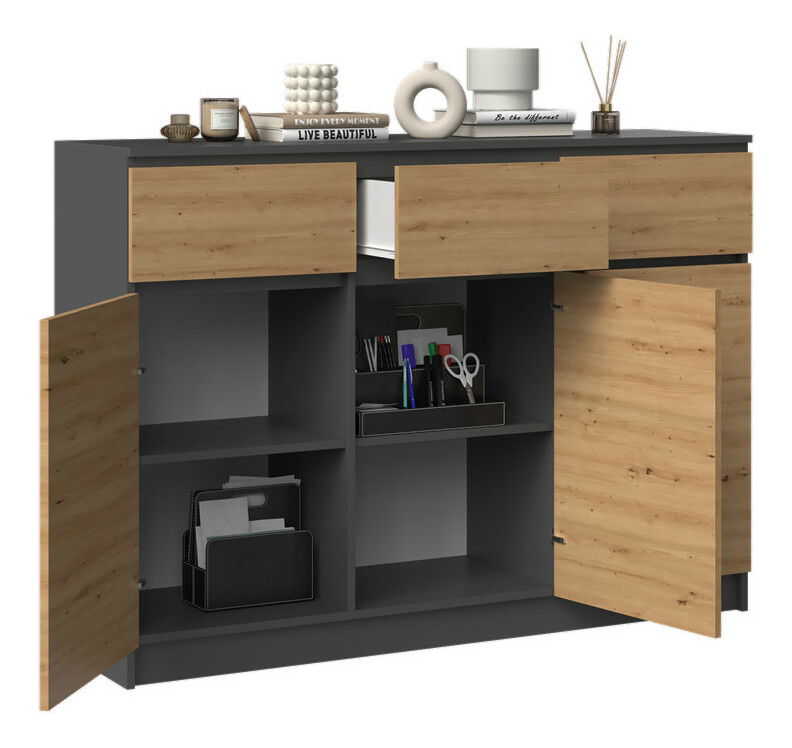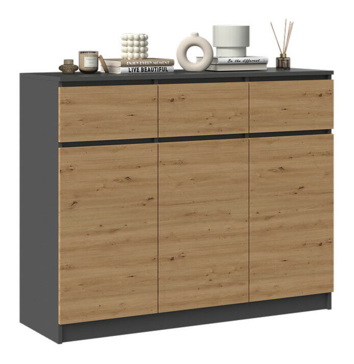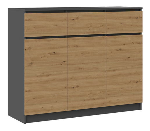 Komoda Musecalo 9 v elegantnej kombinácii antracit a dub artisan je ideálnym riešením pre moderné interiéry. S minimalistickým dizajnom a bezúchytkovými frontami ponúka nielen štýlový vzhľad, ale aj praktické využitie. S tromi pármi dverí a tromi zásuvkami poskytuje dostatok úložného priestoru pre vaše osobné veci. Vyrobená z kvalitnej laminovanej drevotriesky s ABS hranami, zaručuje vysokú odolnosť a dlhú životnosť. Táto komoda sa hodí do spálne, obývačky či detskej izby, pričom jej moderný charakter obohatí každý priestor.