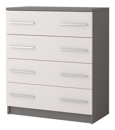 Komoda Oleg II (biela + sivá) o výške 93 cm, šírke 80 cm a hĺbke 40 cm je navrhnutá pre moderné interiéry v minimalistickom štýle. Je vyrobená z 16 mm hrubej drevotriesky pre vonkajšie aj vnútorné časti, čo zaručuje jej pevnosť a odolnosť. Okraje sú doplnené 0,5 mm hrubými ABS hranami, čo pridáva k jej kvalite a estetickému vzhľadu. Komoda má strieborné, plastové úchyty, ktoré sú praktické a zároveň dopĺňajú jej minimalistický dizajn. Bez nožičiek, komoda poskytuje stabilný a priamy kontakt s podlahou. S štyrmi zásuvkami ponúka dostatok úložného priestoru na oblečenie, dokumenty alebo iné predmety. Jej čisté línie a jednoduchý dizajn sú ideálne pre tých, ktorí hľadajú funkčný a štýlový kus nábytku.