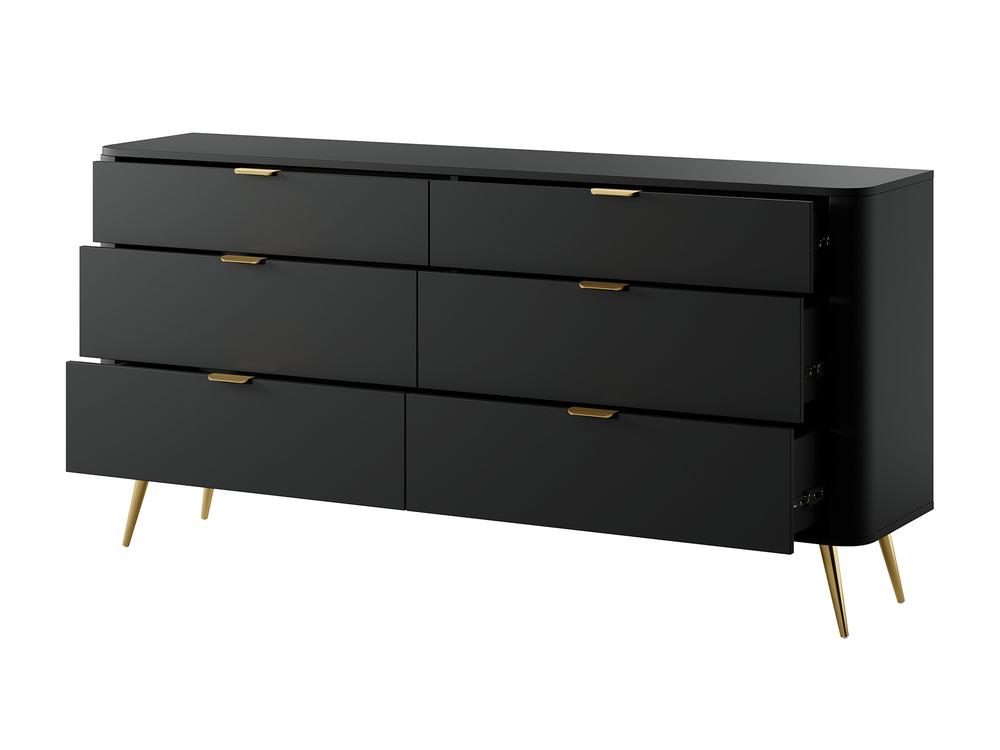 Nudia vás klasické tvary nábytku? Chcete zmeniť svoj byt? Vyberte si kolekciu a prekvapte všetkých svojich hostí Komoda je moderný kus nábytku, ktorý prekvapí svojim tvarom. Zaoblené hrany dodávajú eleganciu a sú vhodné pre deti. Komoda má až šesť zásuviek, ktoré vám uľahčia usporiadanie všetkých potrebných doplnkov a vychytávok. Ďalšou výhodou je stolová doska, kde si môžete vystaviť fotografie svojich blízkych alebo suveníry z dlenky. Nábytok skvele poslúži aj v spálni ako miesto pre drobné oblečenie alebo spodnú bielizeň Detaily produktu: korpus a čelá z laminovanej nábytkovej dosky Kronospan 0190 PE v čiernej farbe, konštrukcia vystužená ABS hranami, ktoré mu dodávajú stabilitu a odolnosť, vysokokvalitná oceľ. nožičky v pochrómovanom zlate, majú malé, biele nožičky, ktoré zabraňujú poškriabaniu podlahy, zásuvky umiestnené na 27 mm guličkových vodidlách, jemné zlaté, brúsené úchytky dodávajú funkčnosť a sú štýlu ozdobou čiel.