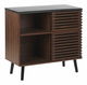 Táto komoda je funkčným kusom nábytku, ktorý bude vyzerať skvele v predsieni, obývačke alebo spálni. Skladá sa zo štyroch hlbokých políc, ktoré možno zavrieť alebo nechať otvorené pomocou posuvných dverí. Do políc sa zmestia knihy, dekorácie alebo rôzne iné drobnosti. Tmavý odtieň, ktorý dokonale imituje skutočné drevo, v kombinácii s lamelovými dverami a nohami z masívneho dreva, robia zo skrinky perfektný doplnok do interiéru ladeného v tradičnom alebo rustikálnom štýle.